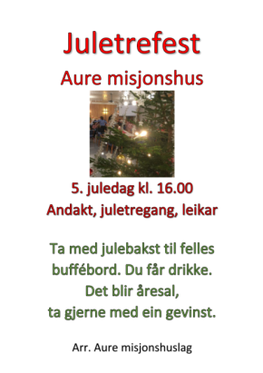 Velkomen til juletrefest for heile familien, 5. juledag kl 16. Andakt ved Lars Lundø, juletregang, overraskingar til barna. Det blir servering og trekking av Misjonshus-lotteriet.
